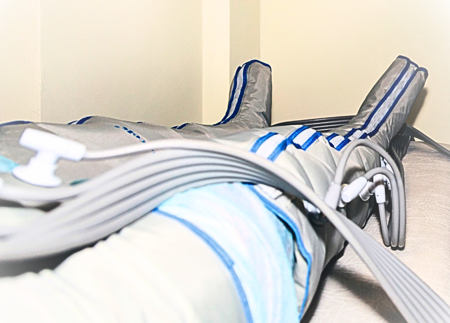 Compression therapy involves utilizing compressed air within specialized boots and attachments to apply gentle massaging pressure to your arms, hips, or legs. This equipment facilitates limb massage, aiding in expediting recovery processes by effectively stimulating the lymphatic system and enhancing blood circulation.